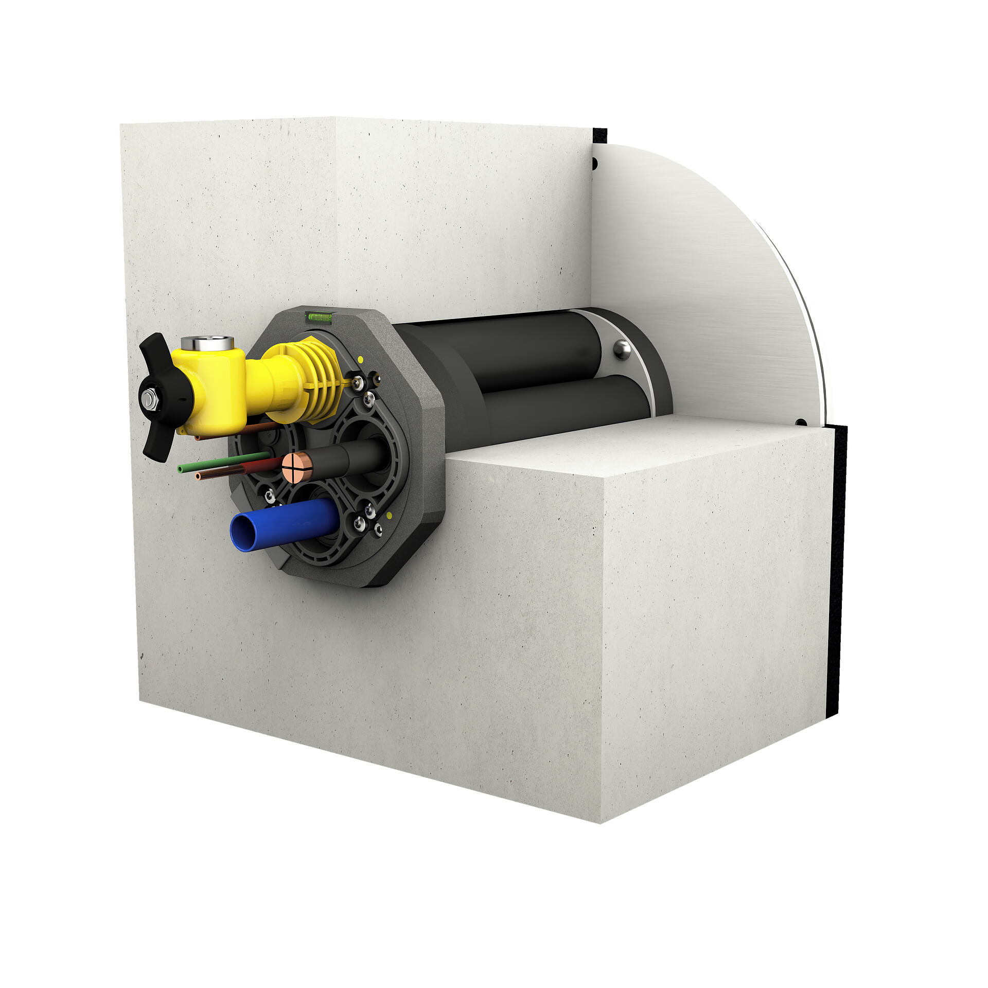 Outer sealing element for multi-line building entry systems - BV 1 with fixed/loose flange for buildings with a basement with waterproof sheeting for standing/pressing water load case to DIN 18533, W2.2-E. Suitable for holding bitumen or foil waterproof sheeting.