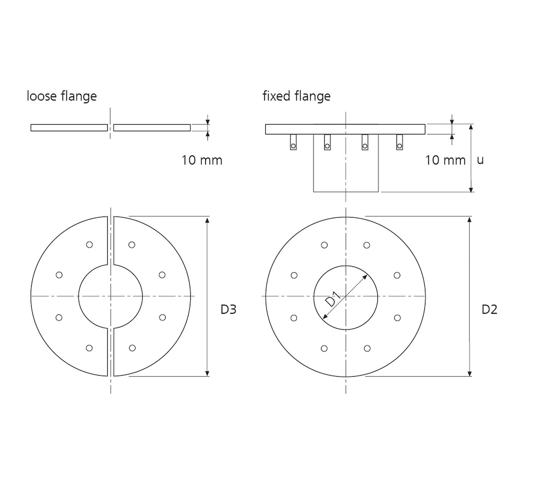 D1: wall sleeve Øi, D2: fixed flange OD, D3: loose flange OD