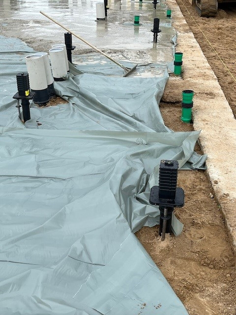 Platzieren der Bodeneinführungen und einbringen der Folie unterhalb der Sauberkeitsschicht.