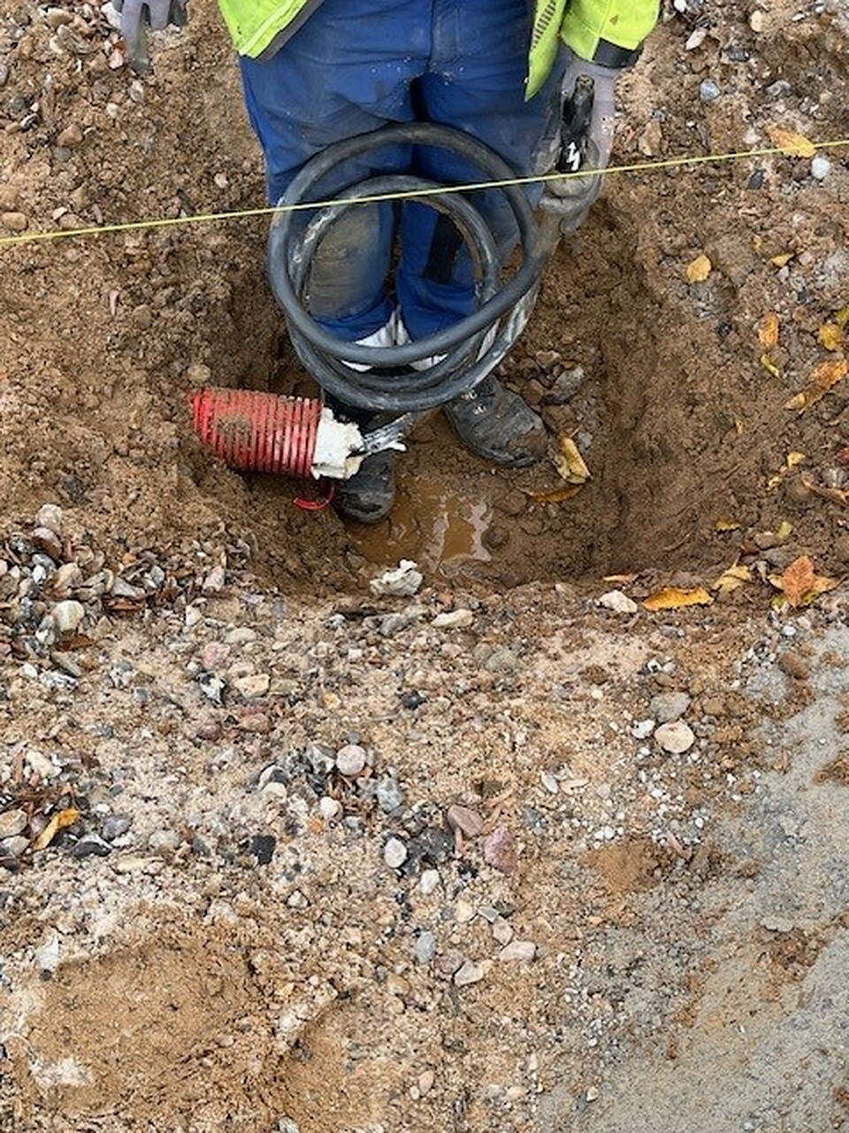 Am zukünftigen Standort wird aufgegraben und die Stromzuleitung für den späteren Anschluss der Ladesäule wird vorab spiralförmig aufgeschlossen.
