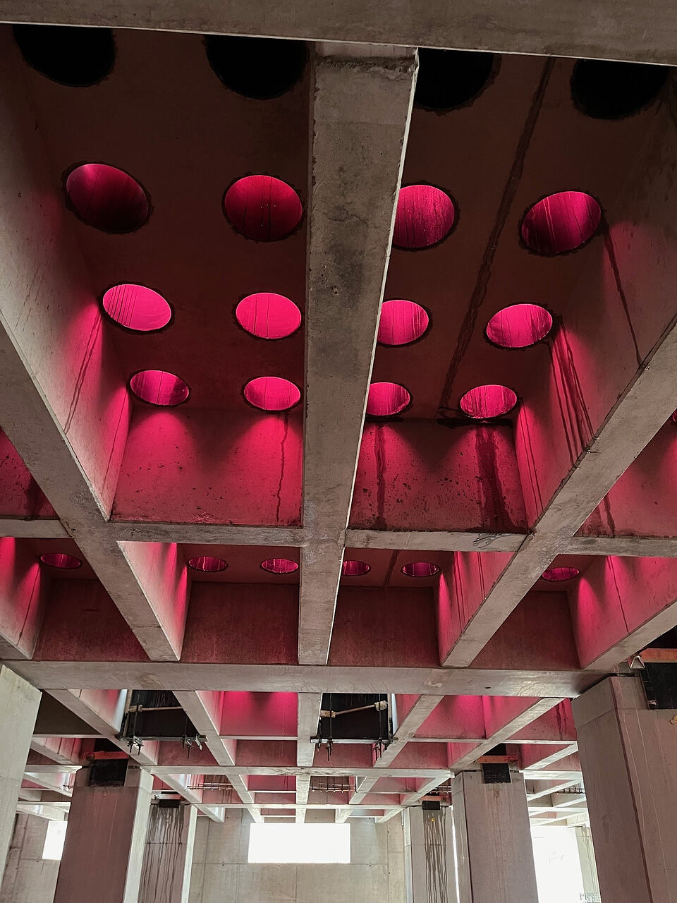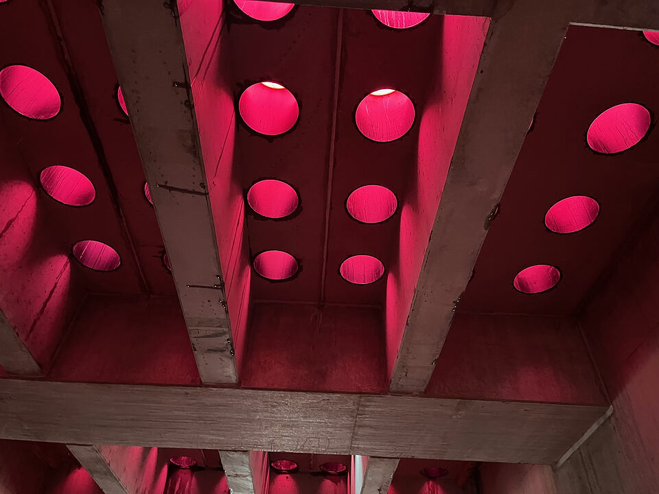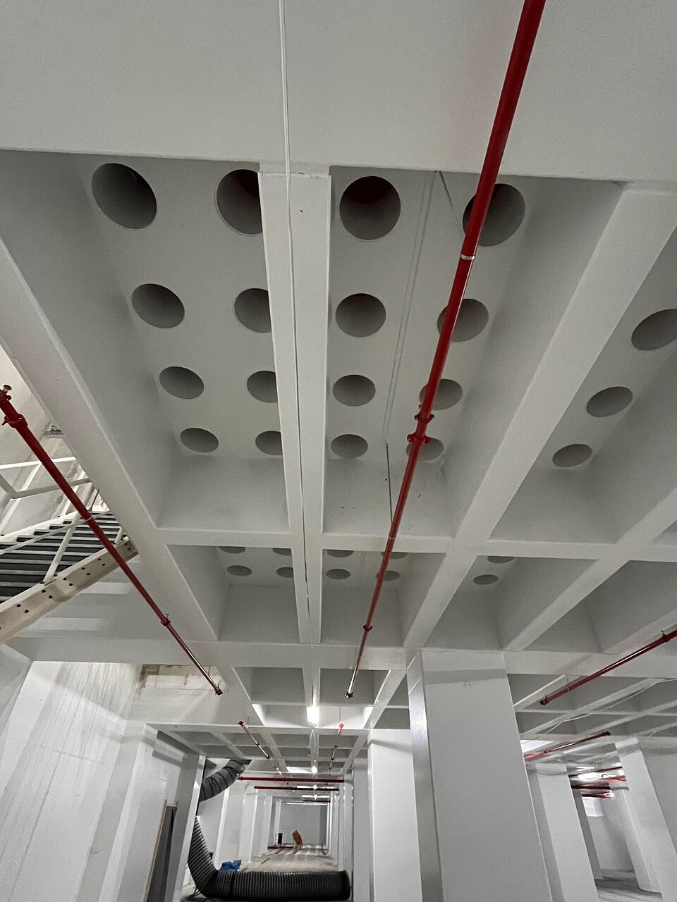 Einzelnes Fertigbetonfeld eines Waffeltisches auf der Lüftungsebene im Rohbau mit integrierten und verschlossenen Zement-Verbund-Rohren.