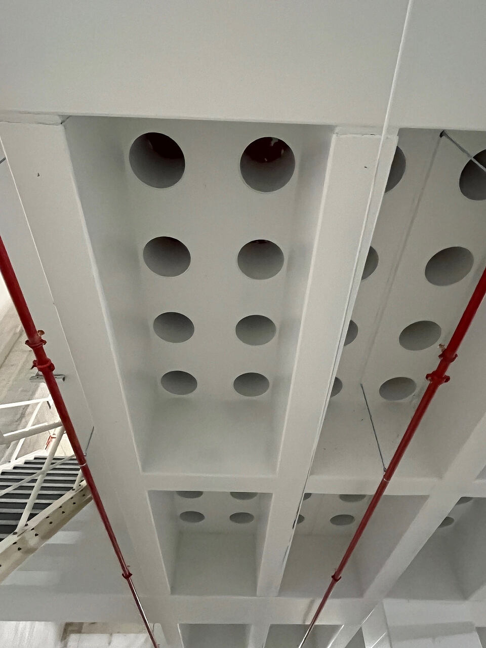 Reihe von Feldern eines Waffeltisches mit integrierten Zement-Verbund-Rohren im Rohbau auf der Reinraumebene.