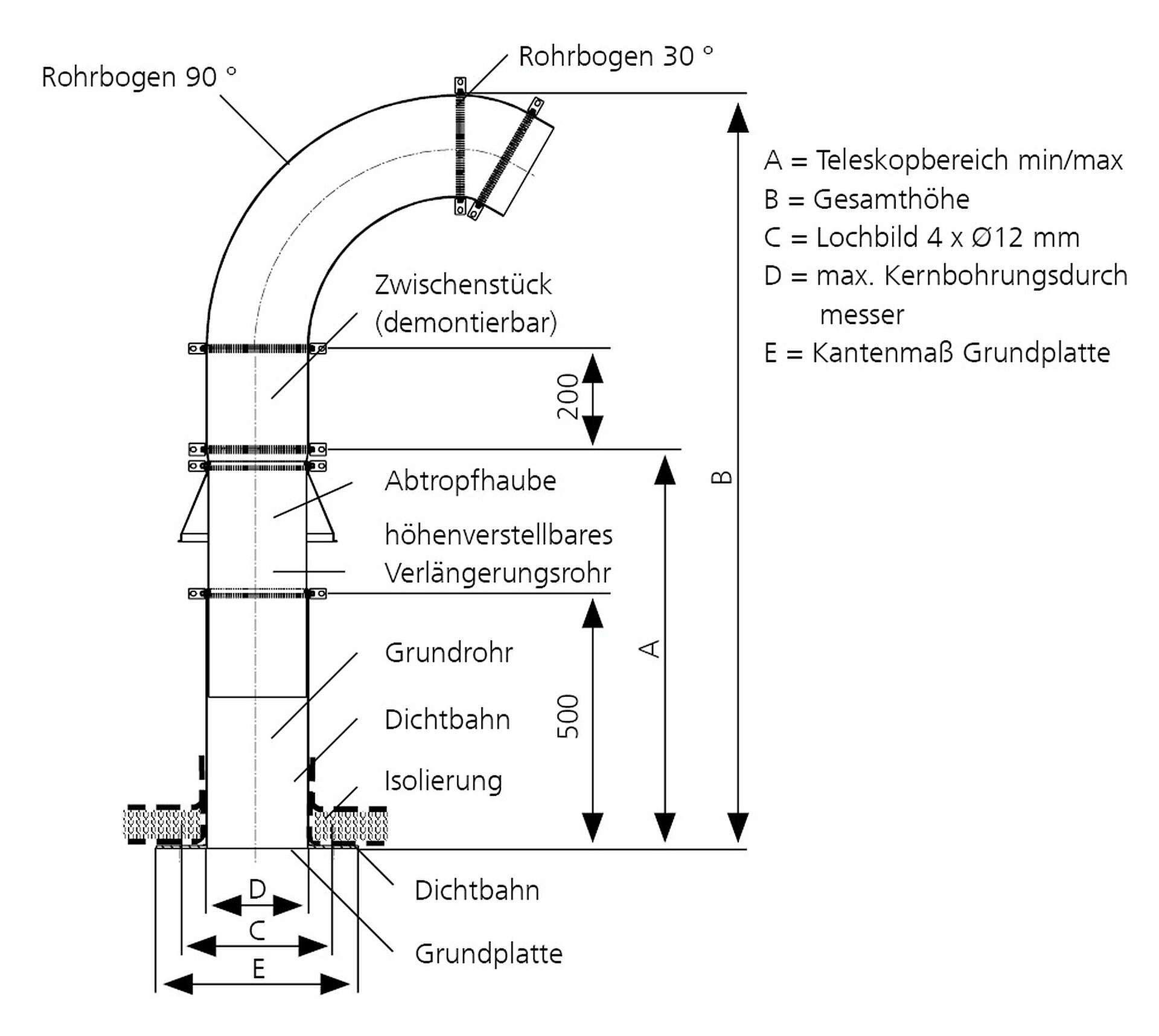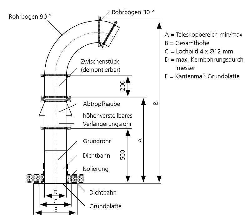 A = Teleskopbereich min/max, B = Gesamthöhe, C = Lochbild 4 x Ø 12 mm, D = max. Kernbohrungsdurchmesser, E = Kantenmaß Grundplatte