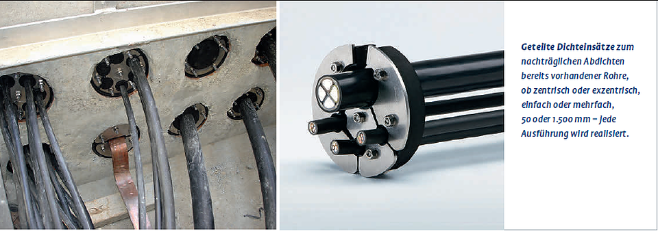 Die Ringraumdichtungen bieten den Kunden alle Möglichkeiten zur zuverlässigen Abdichtung von Mauerdurchgängen für ein oder mehrere Kabel; als geschlossener Dichteinsatz zur Erstinstallation oder in geteilter Ausführung zum nachträglichen Abdichten vorhandener Kabel.
