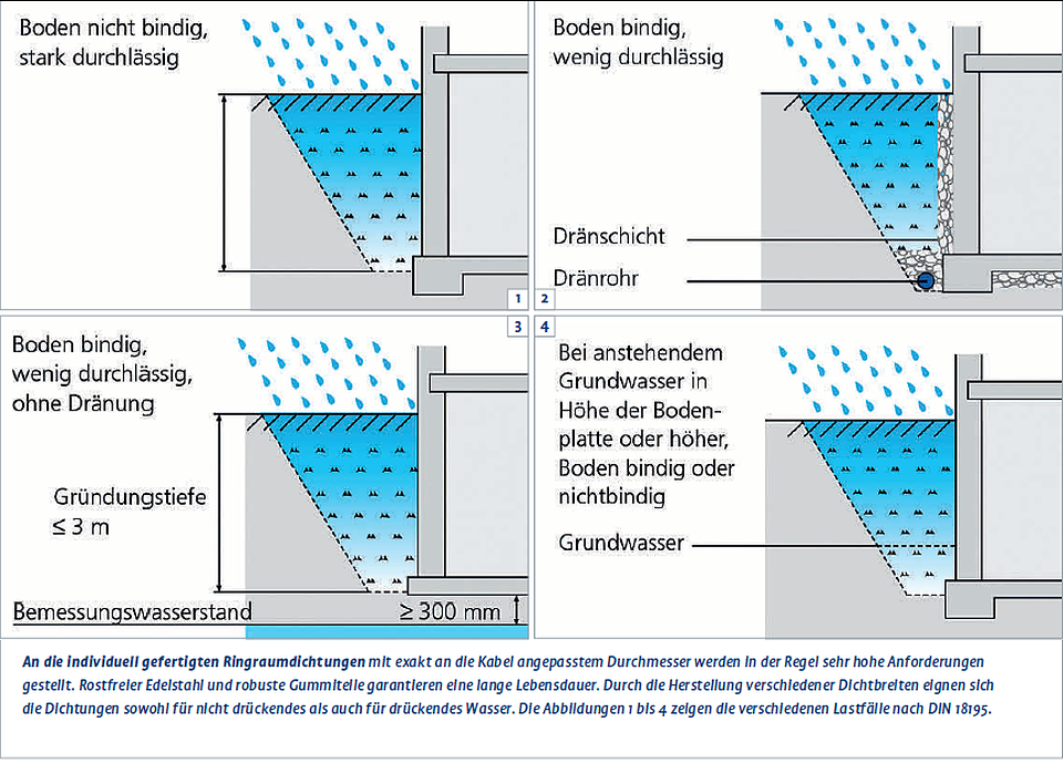 Die fachgerechte Abdichtung erfolgt geplant durch Einbetonierbauteile oder nachträglich mit geteilten Ringraumdichtungen. Welche Methode bevorzugt wird, ist auch eine Philosophiefrage. Die erste Säule der Durchführungssysteme wird geprägt von den Einbetonierbauteilen. Hinzu kommen modular aufgebaute Anschluss- und Abdichtmöglichkeiten, die sogenannten Dichtpackungen HSI 150 oder HSI 90.