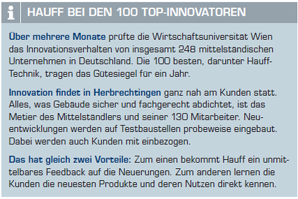 NBR weist zusätzlich eine hohe Widerstandsfähigkeit gegen Öle, Fette und alle handelsüblichen Kraftstoffe auf oder ist auf Wunsch sogar trinkwassergeeignet mit KTW-Empfehlung. Bei Hauff sind die Kunden Innovationstreiber, die oft in frühen Phasen des Innovationsprozesses in Entwicklungsprojekte nach dem Modell der Open Innovation eingebunden werden. Um ihren Ansprüchen an eine einfache und anwenderfreundliche Dichtungstechnik gerecht zu werden, machen sich täglich Entwickler Gedanken über die Zukunft der Ringraumdichtung.
