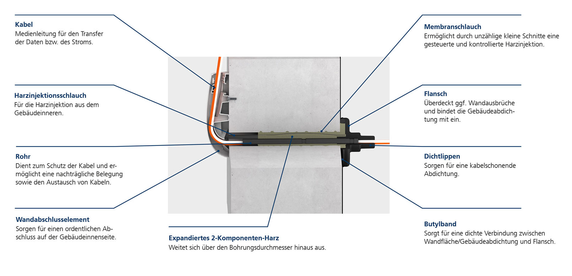 Das Membran-Injektionssystem ist eine universelle Nachrüsttechnologie und lässt sich flexibel in unterschiedlichsten Bausituationen einsetzen. Es eignet sich für alle gängigen Wandtypen und ermöglicht zuverlässige Abdichtungen für eine Vielzahl von Kabeln und Rohren – einschließlich Standarddurchmessern für Glasfaser-Mikropipes. Dank der einfachen Handhabung und der sicheren Abdichtung verschiedener Medienleitungen bieten MIS-Lösungen eine effiziente, praxistaugliche Option für den nachträglichen Einbau.